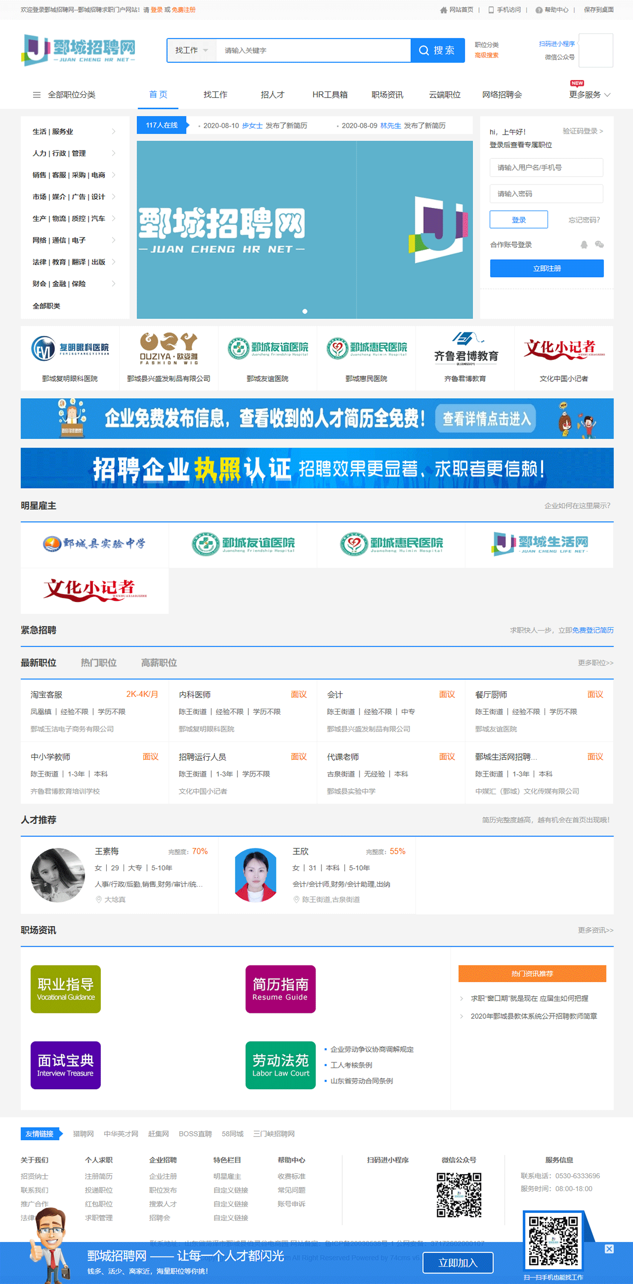 鄄城招聘網(wǎng),是鄄城生活網(wǎng)主辦的一家求職招聘門戶網(wǎng)站。提供權(quán)威的鄄城人才招聘信息,事業(yè)單位招聘信息,人事代理等服務(wù),是鄄城人民值得信賴的鄄城人才招聘網(wǎng)上平臺。