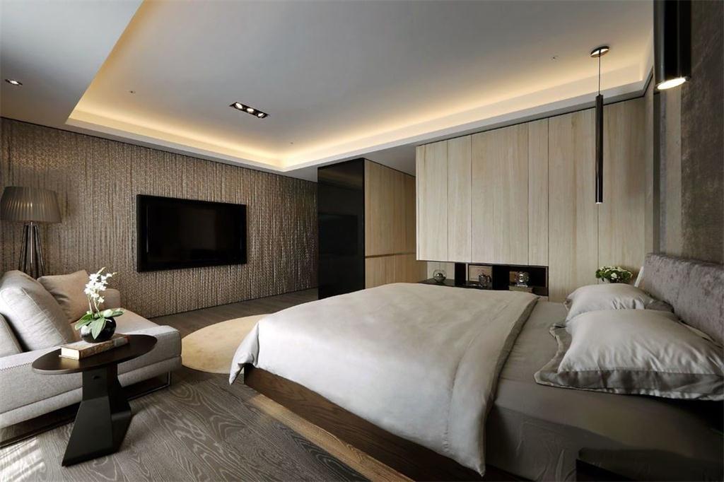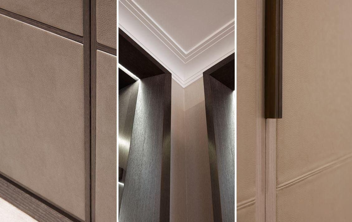 精致的深棕紋理染色木皮與米色壁紙勾勒出
