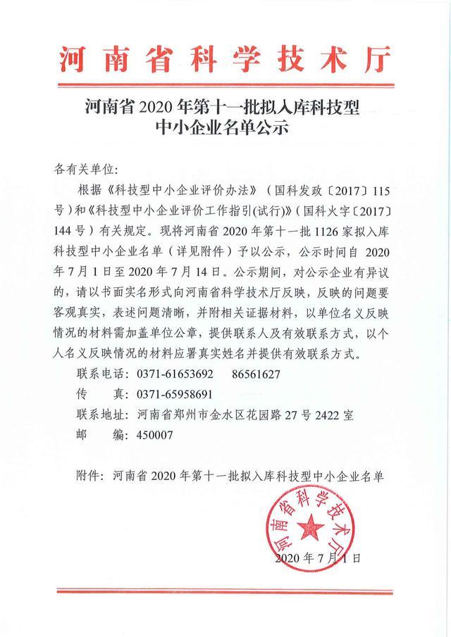 近日,河南省科學(xué)技術(shù)廳發(fā)布《河南省2020年第十一批擬入庫科技型中小企業(yè)名單公示》,根據(jù)有關(guān)規(guī)定,將河南省2020年第十一批1126家擬入庫科技型中小企業(yè)名單予以公示。公示時間自2020年7月1日至2020年7月14日。